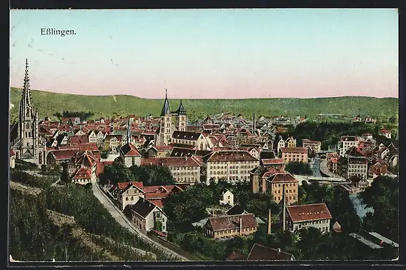 Goldfenster-AK Esslingen / Neckar, Teilansicht mit Kirche und Strassenpartie