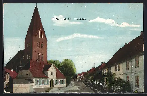 Goldfenster-AK Klütz i. Meckl., Kirche mit leuchtenden Fenstern am Marktplatz