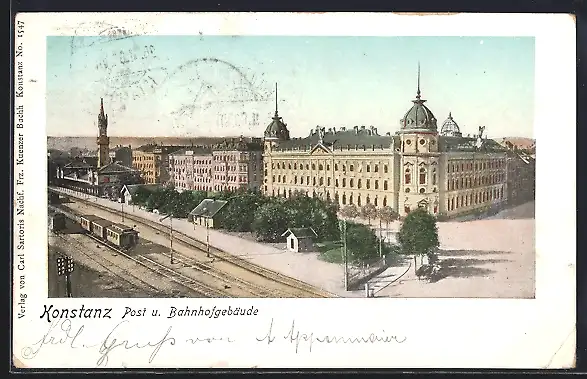 Goldfenster-AK Konstanz, Post und Bahnhofgebäude von oben, mit goldenen Fenstern