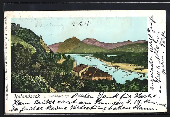 Goldfenster-AK Rolandseck, Panorama mit Siebengebirge