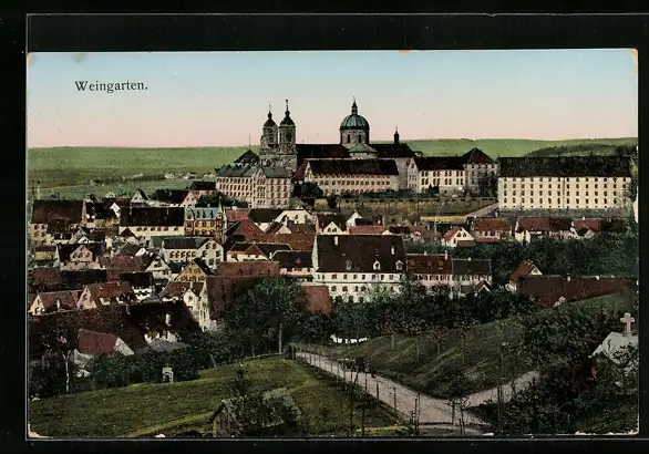 Goldfenster-AK Weingarten i. W., Teilansicht mit Benediktiner Abtei