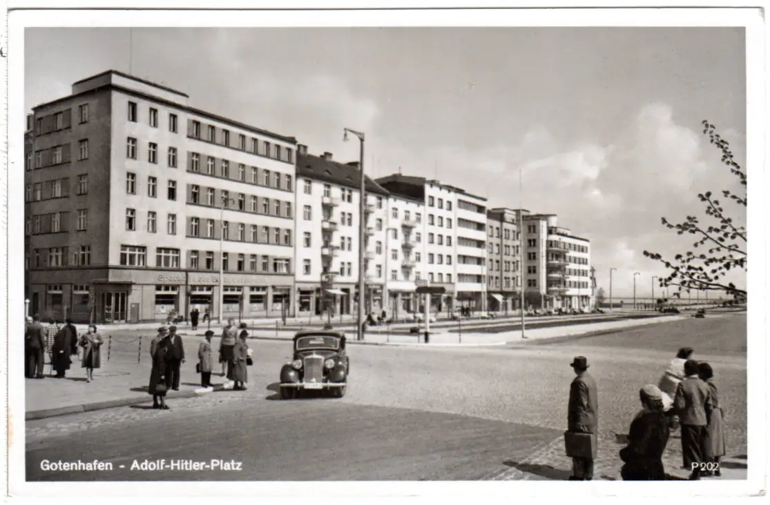 Gotenhafen, Adolf-Hitler-Platz m. Personen u. Oldtimer, 1941 gebr. Danzig sw-AK