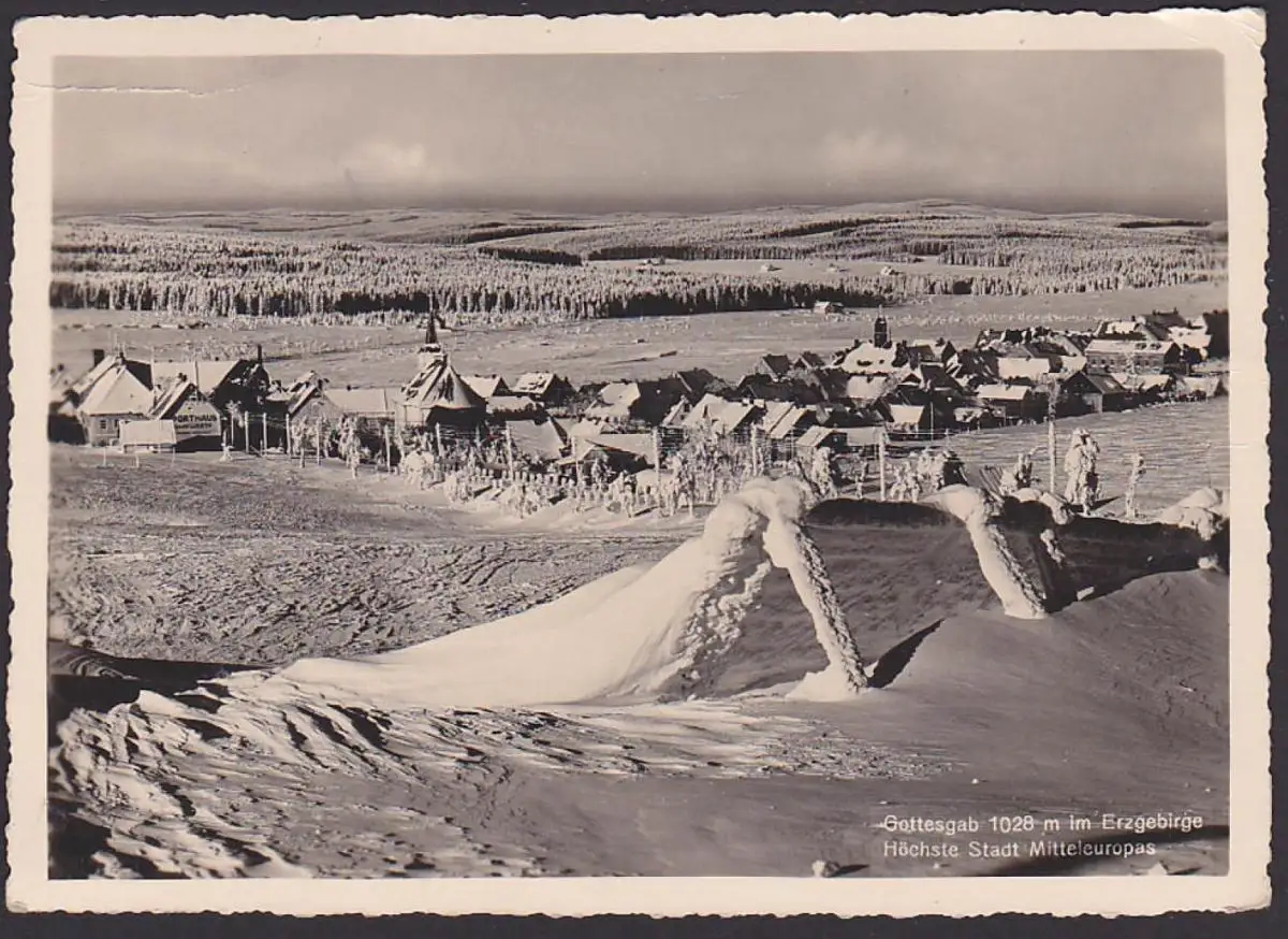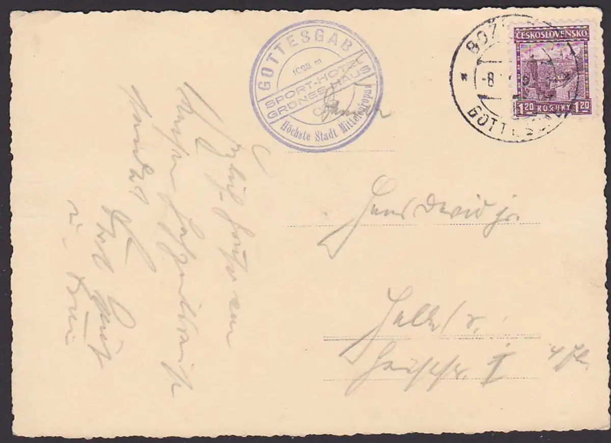 Gottesgab höchste Stadt Mitteleuropas Sporthotel Grünes Haus zweisprachiger Stempel Fotokarte