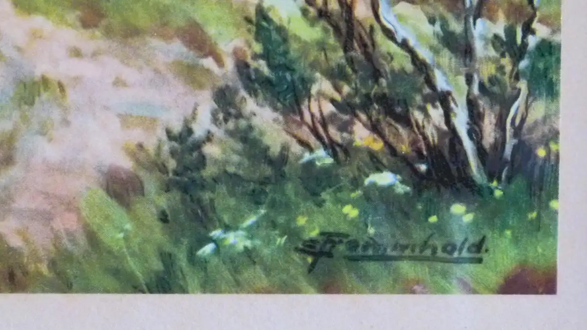 Grafik von Ernst Frommhold mit einer ruhigen Landschaft, die einen Pfad durch üppiges Grün zu einer fernen Landschaft zeigt. Gerahmt in Holz mit Glas. Sehr guter Zustand. Ideal für Sammler von Vintage-Kunst oder als eleganter Wand-Akzent.
