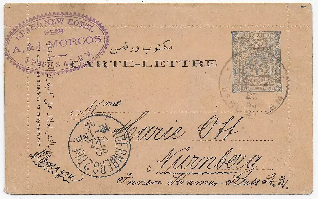 Grand New Hotel Jerusalem, türkischer Kartenbrief nach Nürnberg 1896