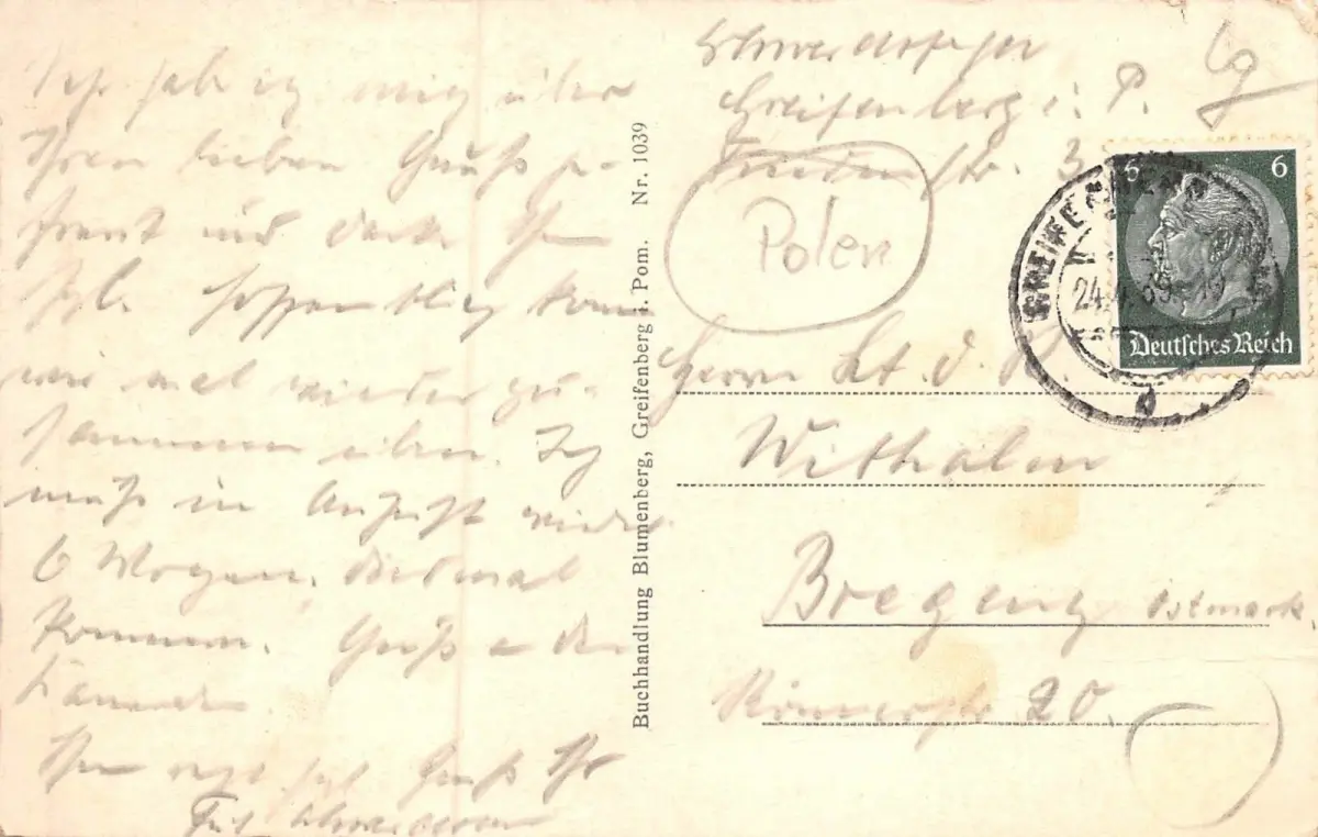 Rückseite: gelaufen 1939 von Greifenberg (Pom.)