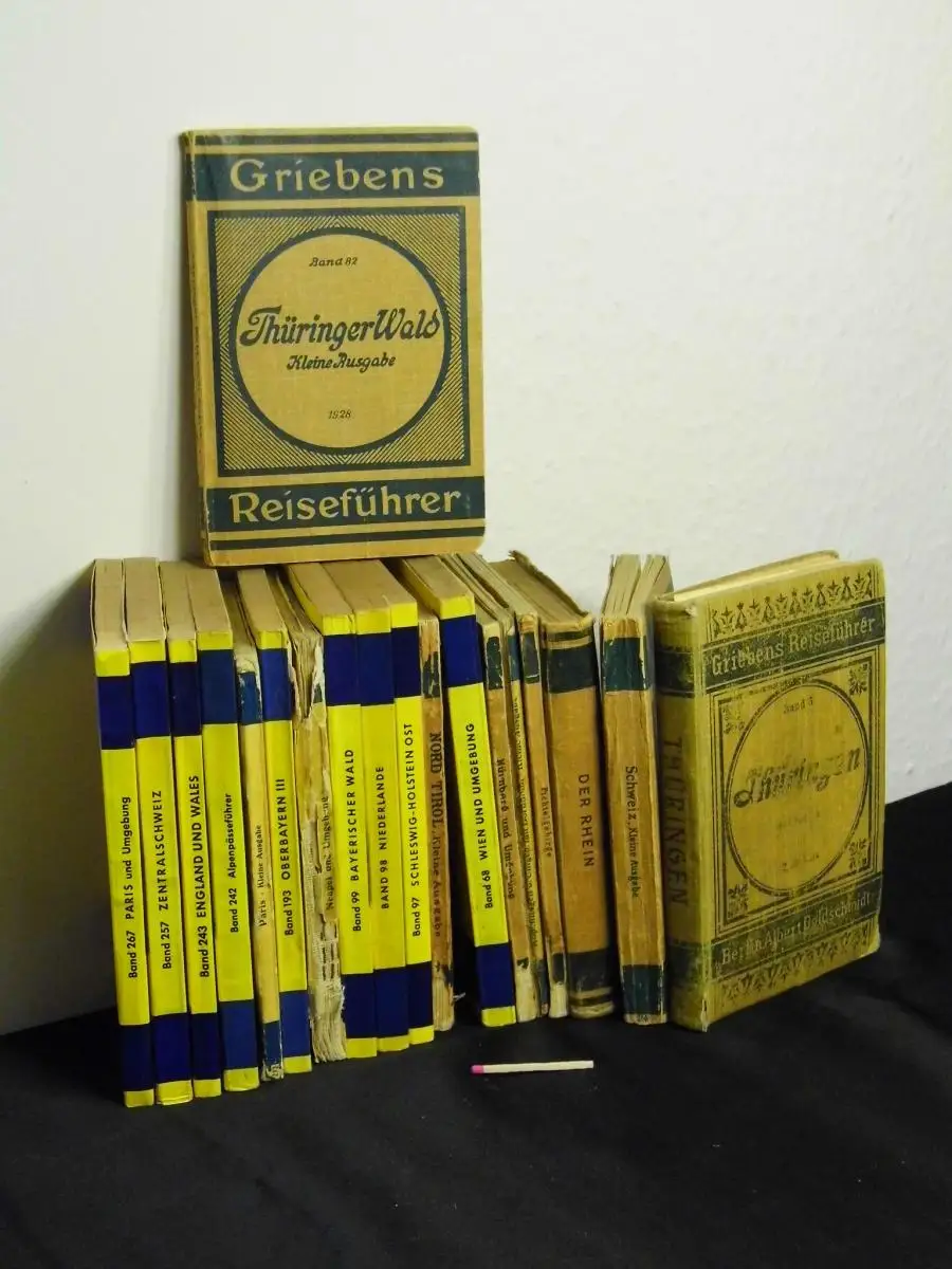 Mit Abbildungen und Karten, sowie teilweise mit einer entnehmbaren Faltkarte - enthält: 3: Thüringen 25.A. + 6: Berlin 1960 (ohne Plan) + 24: Schweiz kleine Ausgabe 30.A. + 29: Der Rhein von Düsseldorf bis Mannheim 32.A. + 35: Fichtelgebirge 21.A. + 58: Kopenhagen und Umgebung mit Bornholm kleine Ausgabe 30.A. + 62: Nürnberg und Umgebung 22.A. + 68: Wien und Umgebung (1967?) + 82: Thüringer Wald Kleine Ausgabe 34.A. + 90: Nord-Tirol und Vorarlberg kleine Ausgabe 32.A. + 97: Schleswig-Holstein Ost (1973) + 98: Niederlande (1959) + 99: Bayerischer Wald. Oberpfälzer Wald Niederbayern (1971) + 101: Neapel und Umgebung 10.A. + 193: Oberbayern III (1962) + 212: Paris kleine Ausgabe 22.A. + 242: Alpenpässe + 243: England und Wales (1972) + 257: Zentralschweiz mit Tessin (1967) + 267: Paris und Umgebung (1973) - ACHTUNG, im Moment nicht alle Bände auf dem ersten Foto - - Kein Einzelbandverkauf über die Internetmarktplätze. - ACHTUNG, kein Einzelverkauf über die Internet-Marktplätze - leicht bis deutlich berieben und bestoßen mit Randläsuren, leicht bis deutlich nachgedunkelt, teilweise mit Namenseintragung eines Vorbesitzers, einzelne Karten können fehlen, nicht kollationiert, einige Rücken beschädigt, einmal mit großer Tesareparatur - als Belegexemplare bzw. zur Sammlungskomplettierung geeignet - intern599-1931 - Broschuren (Paperback) + 2x flexible Leinenbände.