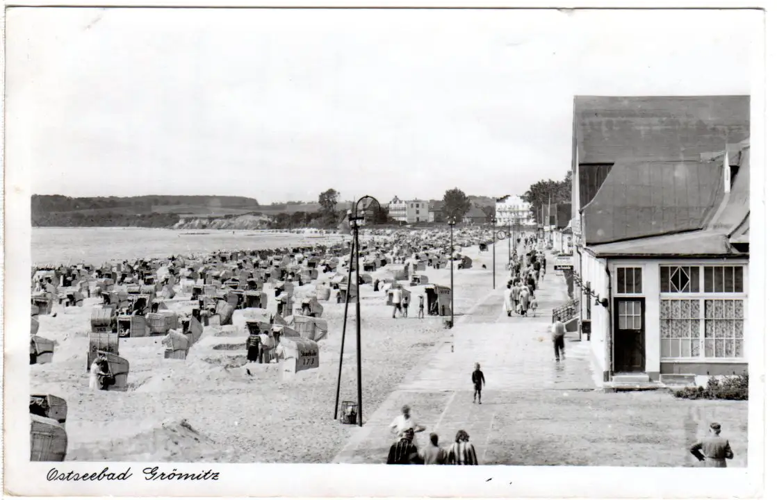 Grömitz, Strand m. Personen u. Gebäuden, 1948 gebr. sw-AK