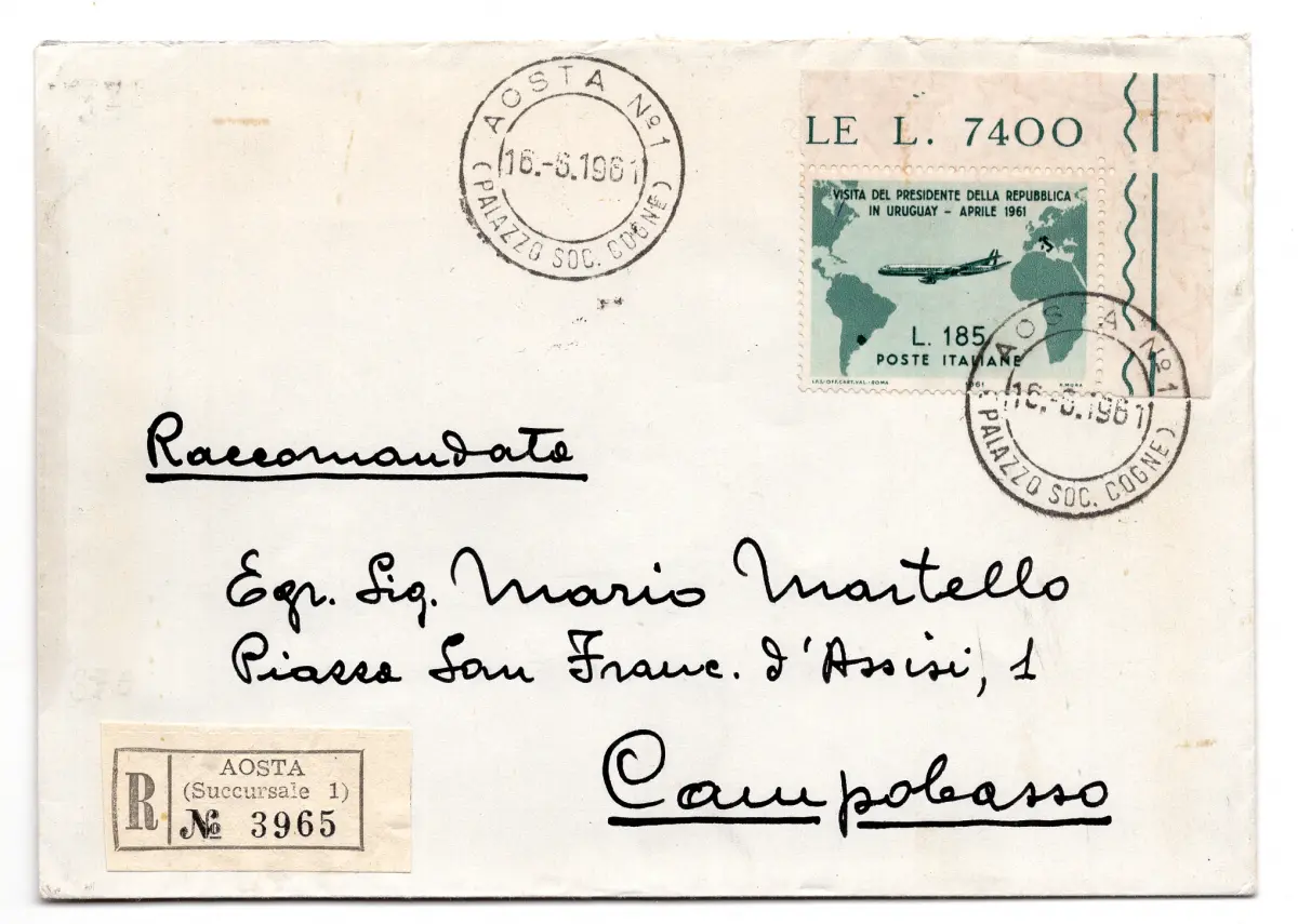 - Gronchi Lire 185 Nr. 919 isoliert a. di f. auf Umschlag Racc. von Aosta nach Campobasso am 16.5.61 - Nicht üblich auch als philatelistische Nutzung Nr. 496/18