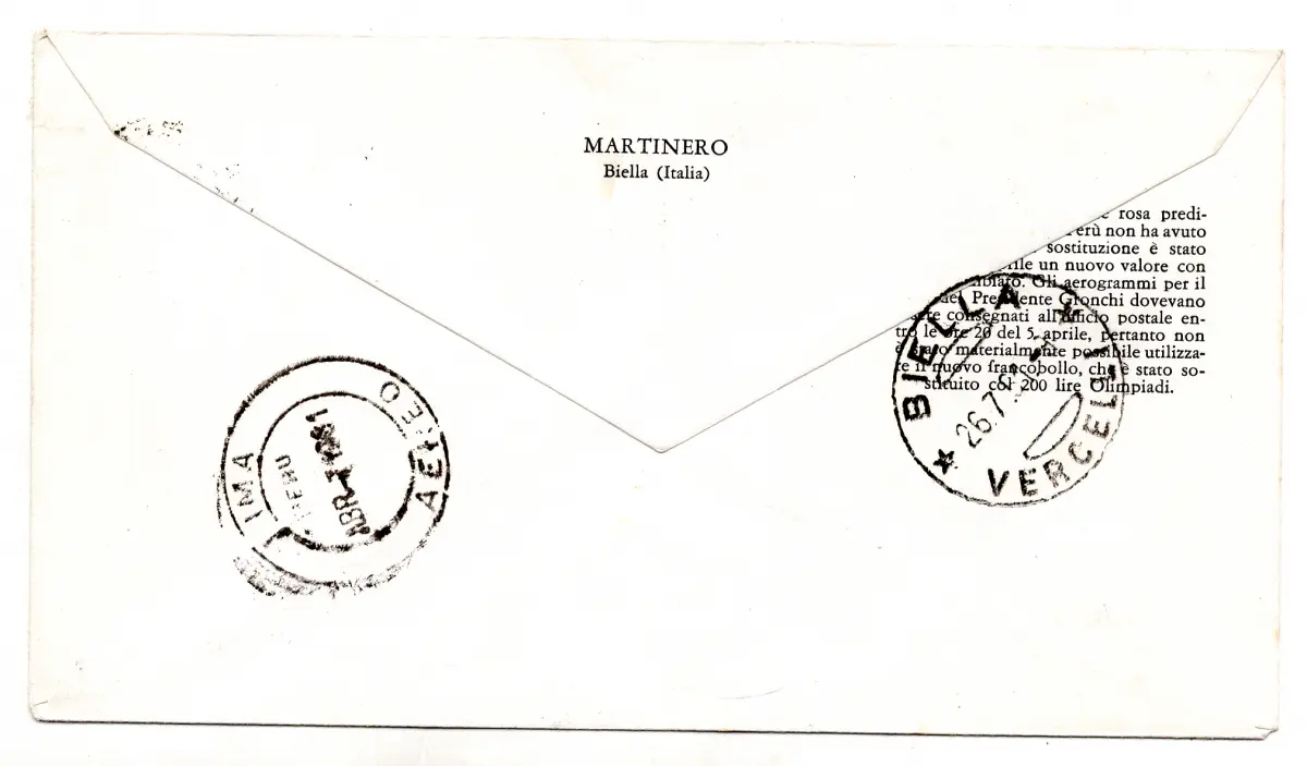 Gronchi-Reise nach Peru - frankiertes Aerogramm mit 200 Lire Olympische Spiele - Gronchi-Reise nach Peru - Aerogramm vom 6.4.61 Racc. nach Lima mit außergewöhnlich frankiertem Präsidentenflug mit 200 Lire Olympiade Nr. 893 - Ungewöhnlicher Code 279/7