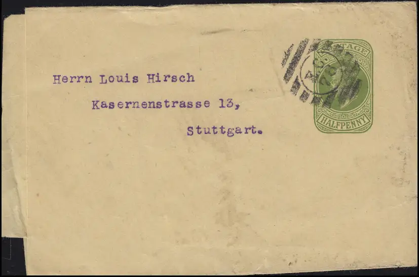Großbritannien Streifband 1/2 P König Eduard VII. Stempel E.C. 76 nach Stuttgart