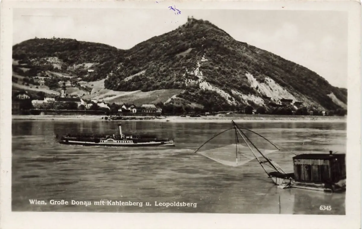 Große Donau mit Kahlenberg und Leopoldsberg Wien Österreich Postkarte AK