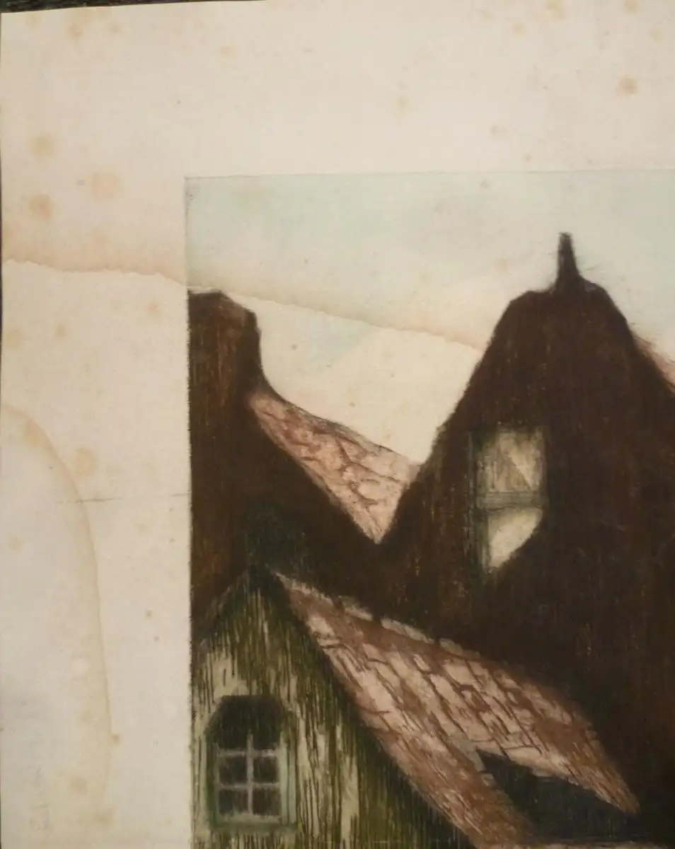 Große Farbradierung, Bildgröße 50x42cm, Blattgröße 70x55cm. Mittelfalte, stärker wasserrandig, oben bis inn die Darstellung, und vor allem im Randbereich etwas fleckig.