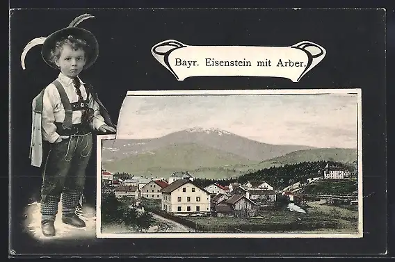 Gruss-AK Bayerisch Eisenstein, Ortsansicht mit Arber, Kleiner Trachtenbub