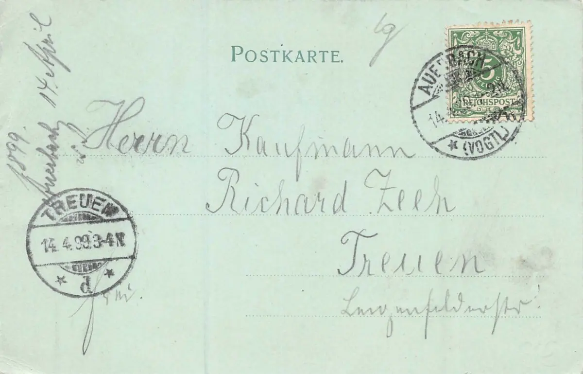 Rückseite: gelaufen 1899 von Auerbach (Vogtl.) nach Treuen