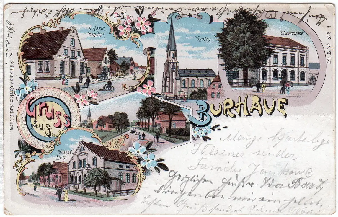Gruss aus BURHAVE, u.a.m. Post u. Gasthof, 1902 gebr. Litho-AK