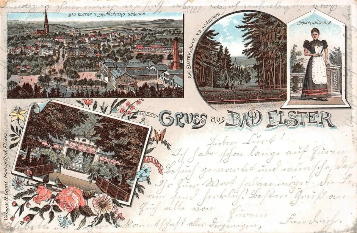 Gruss aus Bad Elster v. Brunnenberg gesehen Agnesruh Litho AK 1897