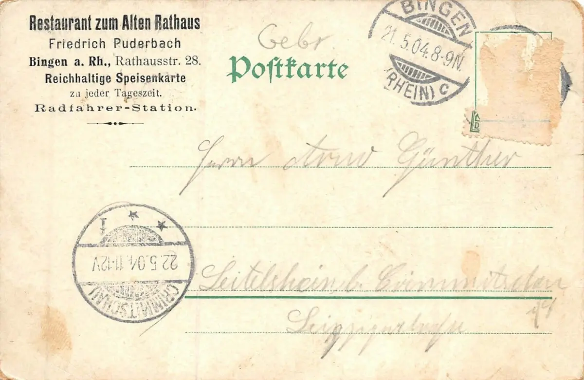 Rückseite: gelaufen 1904 von Bingen (Rhein) nach Crimmitschau