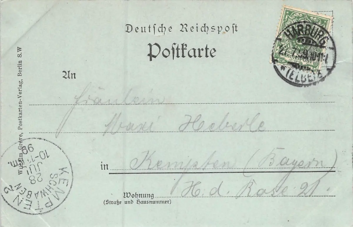 Rückseite: gelaufen 1899 von Harburg (Elbe) nach Kempten (Schwaben)