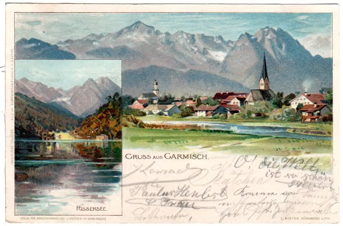 Gruss aus Garmisch m. Rissersee, 1898 gebr. Künstler Litho-AK