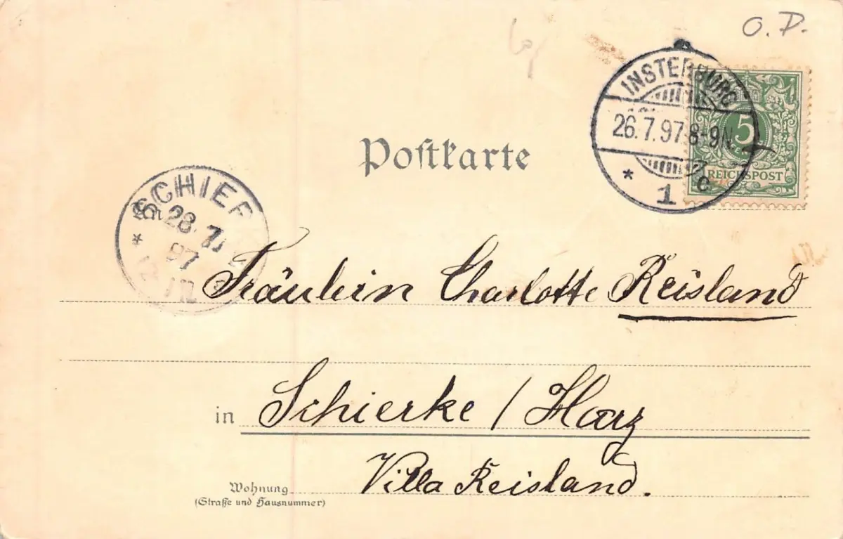 Rückseite: gelaufen 1897 von Insterburg nach Schierke