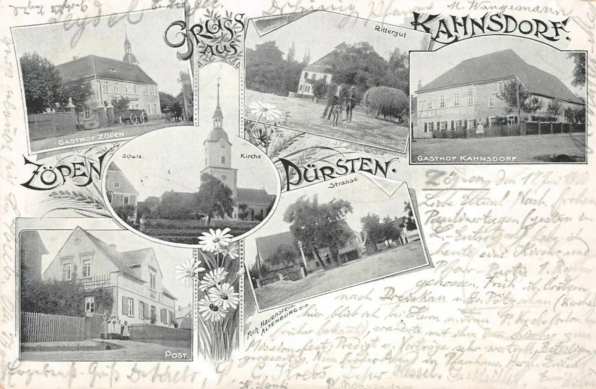 Gruss aus Kahnsdorf Zöpen Dürsten Kirche Rittergut Gasthof Postkarte AK 1900