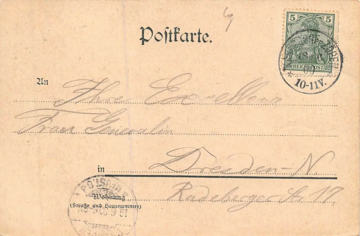 Rückseite: gelaufen 1900 von Kahnsdorf-Zöpen nach Dresden-Neust.