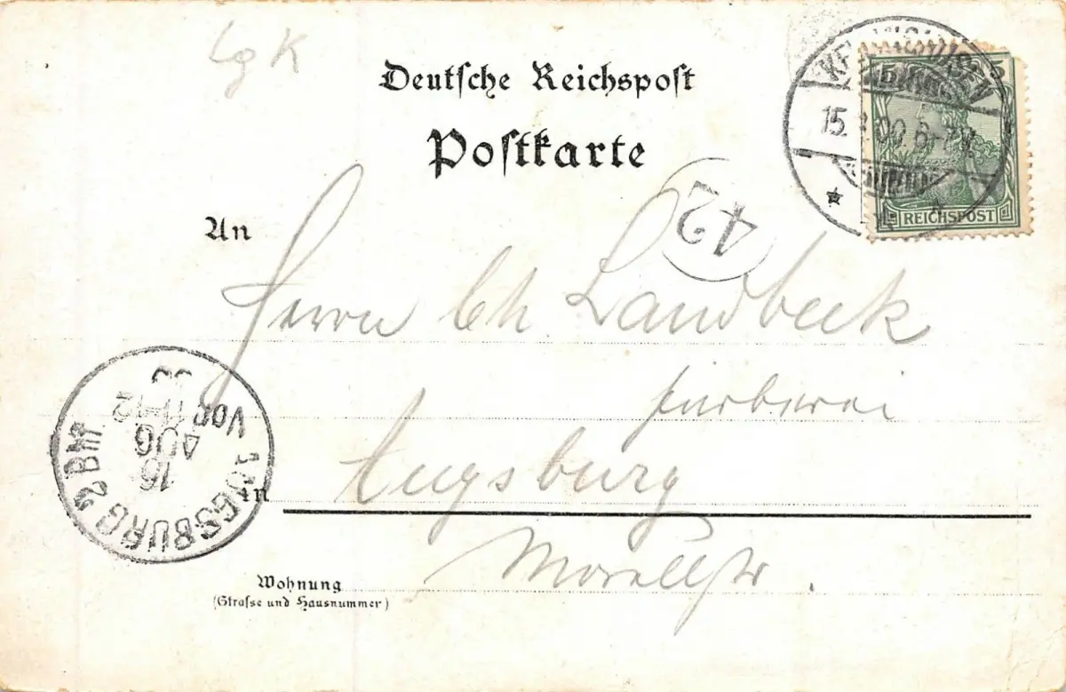 Original Postkarte Maße 9 x 14 cm Rückseite: g elaufen 1900 von Kellinghusen nach Augsburg Zustand: leichte Gebrauchsspuren, Knick