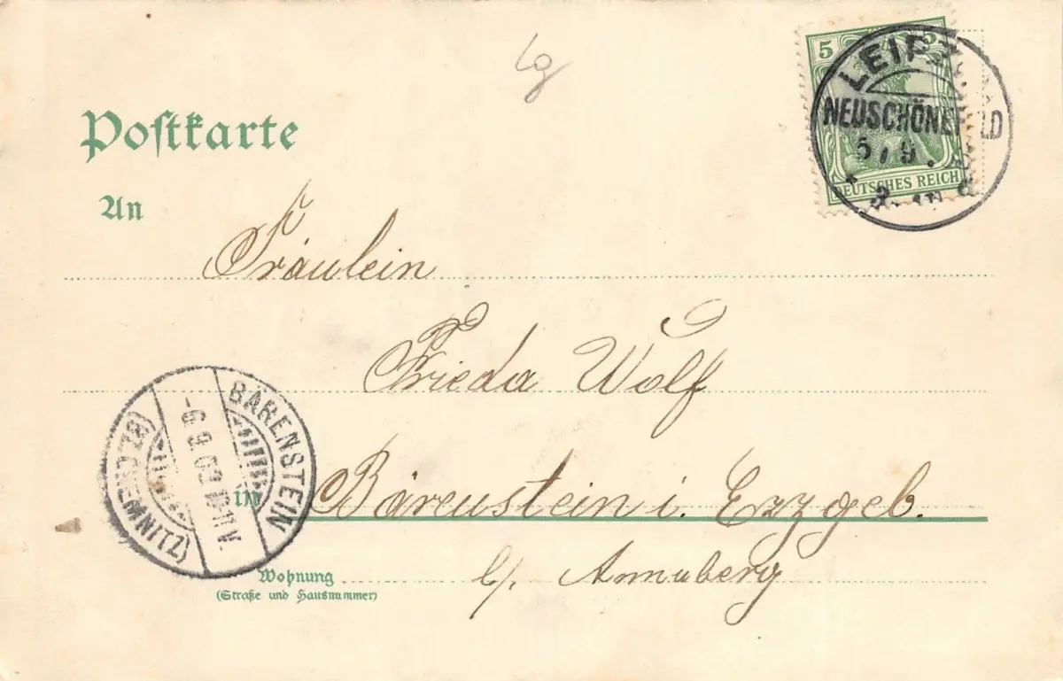 Rückseite: gelaufen 1903 von Leipzig nach Bärenstein (Bz. Chemnitz)