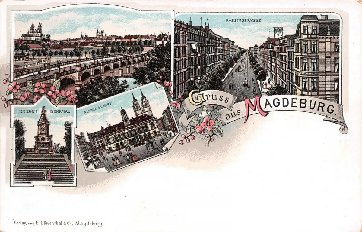 Gruss aus Magdeburg Kaiserstrasse Alter Markt Kriegerdenkmal Litho AK
