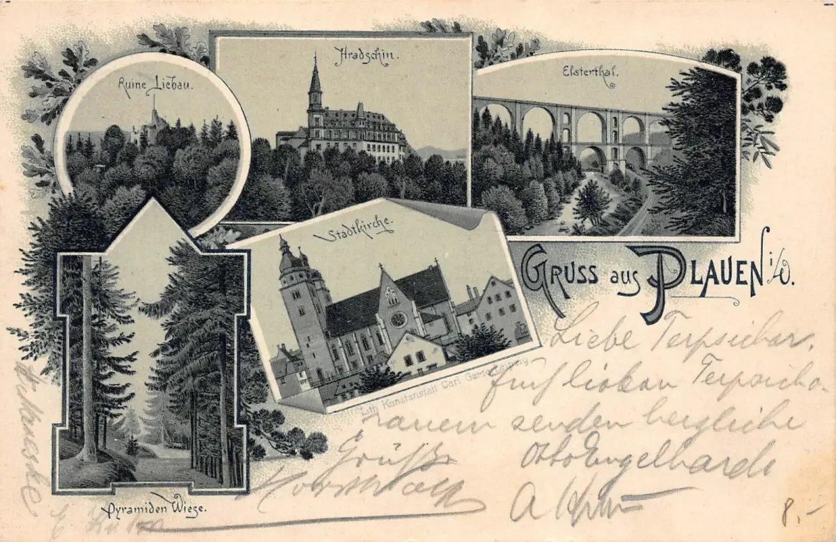Gruss aus Plauen Ruine Liebau und Stadtkirche Vogtland Sachsen Postkarte AK 1900
