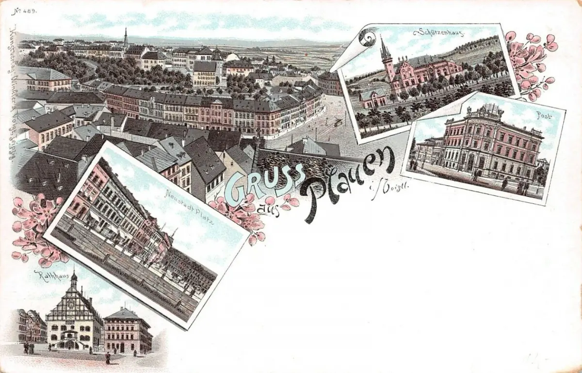 Gruss aus Plauen i./Voigtl. Schützenhaus Post Neustadt Marktplatz Postkarte AK