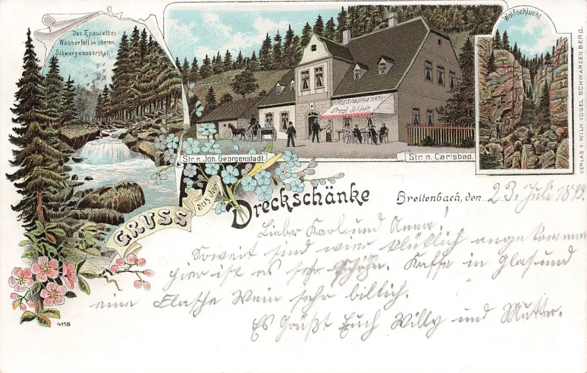Gruss aus Restauration Dreckschänke Breitenbach Potůčky Böhmen Litho AK 1899
