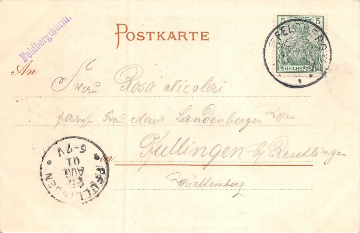 Rückseite: gelaufen 1901 von Feldberg nach Pfullingen