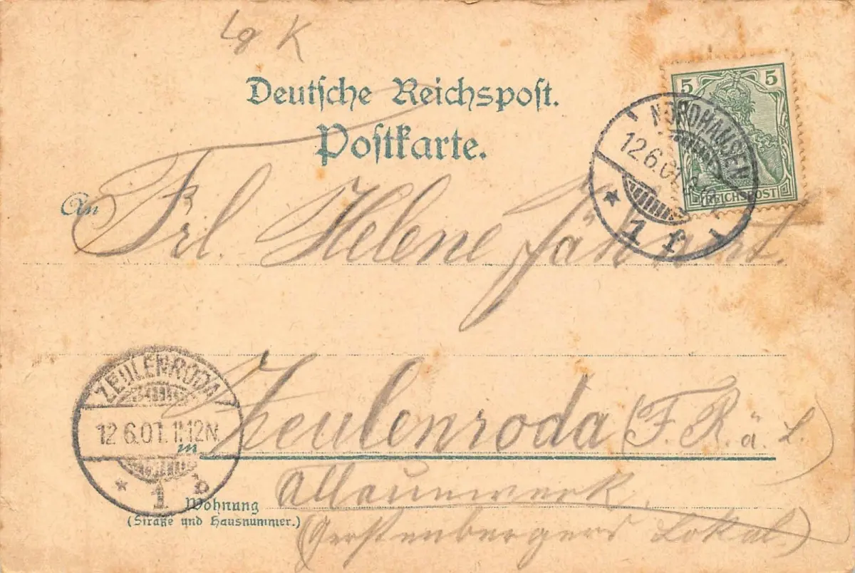 Rückseite: gelaufen 1901 von Nordhausen nach Zeulenroda