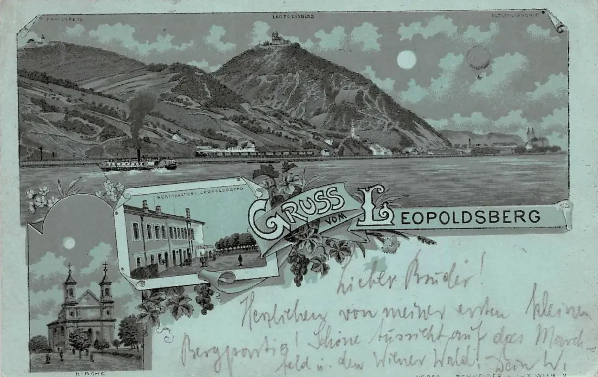 Gruss vom Leopoldsberg Restauration Kirche Dampfer Postkarte AK 1904