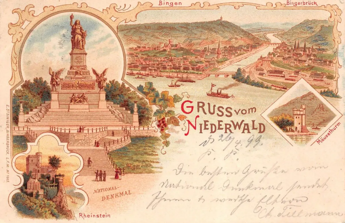 Gruss vom Niederwald Rheinstein Bingen Mäusethurm Litho Postkarte AK 1899