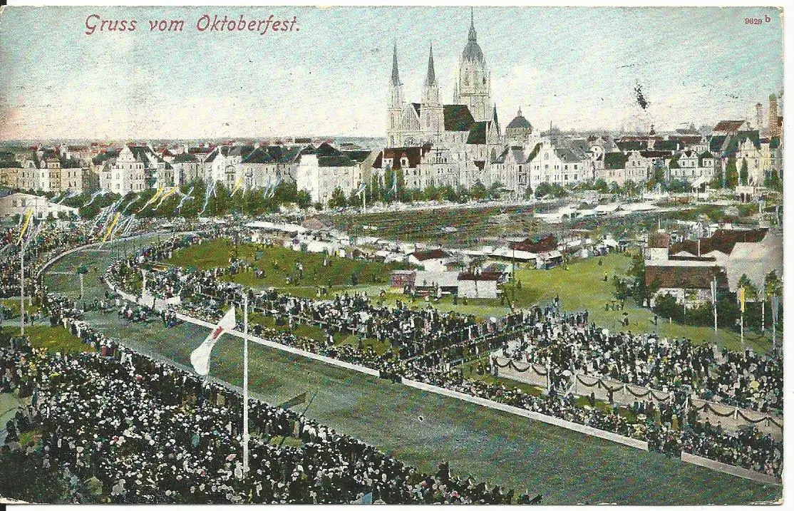 Gruss vom Oktoberfest, 1908 gebr. München Farb AK m. Pferderennbahn