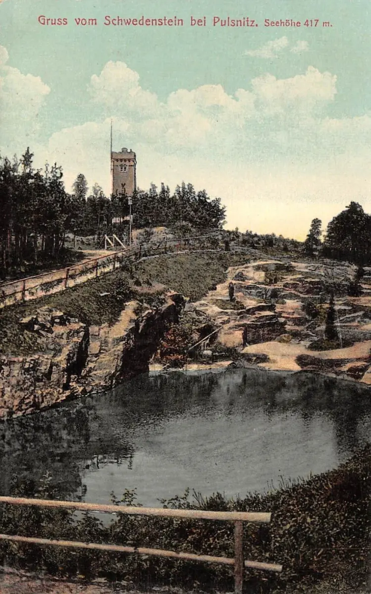 Gruss vom Schwedenstein mit Aussichtsturm bei Pulsnitz Sachsen Postkarte AK 1915