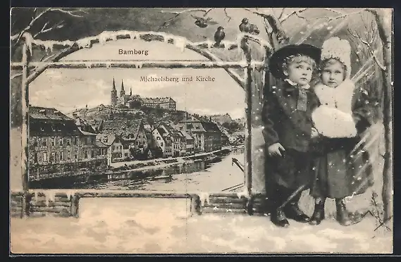 Grusskarten-AK Bamberg, Kindern in Winterkleidung und Michaelsberg und Kirche