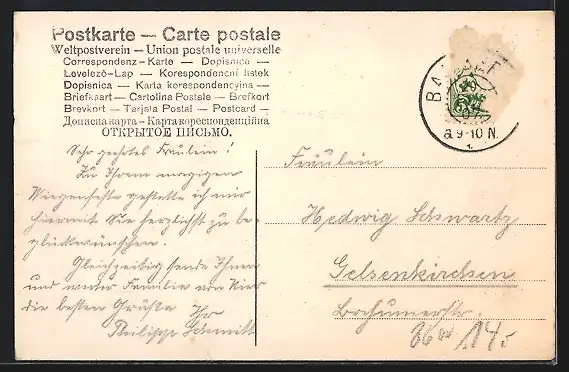 alte Ansichtskarte, gelaufen 1907, Briefmarke entfernt, guter Zustand