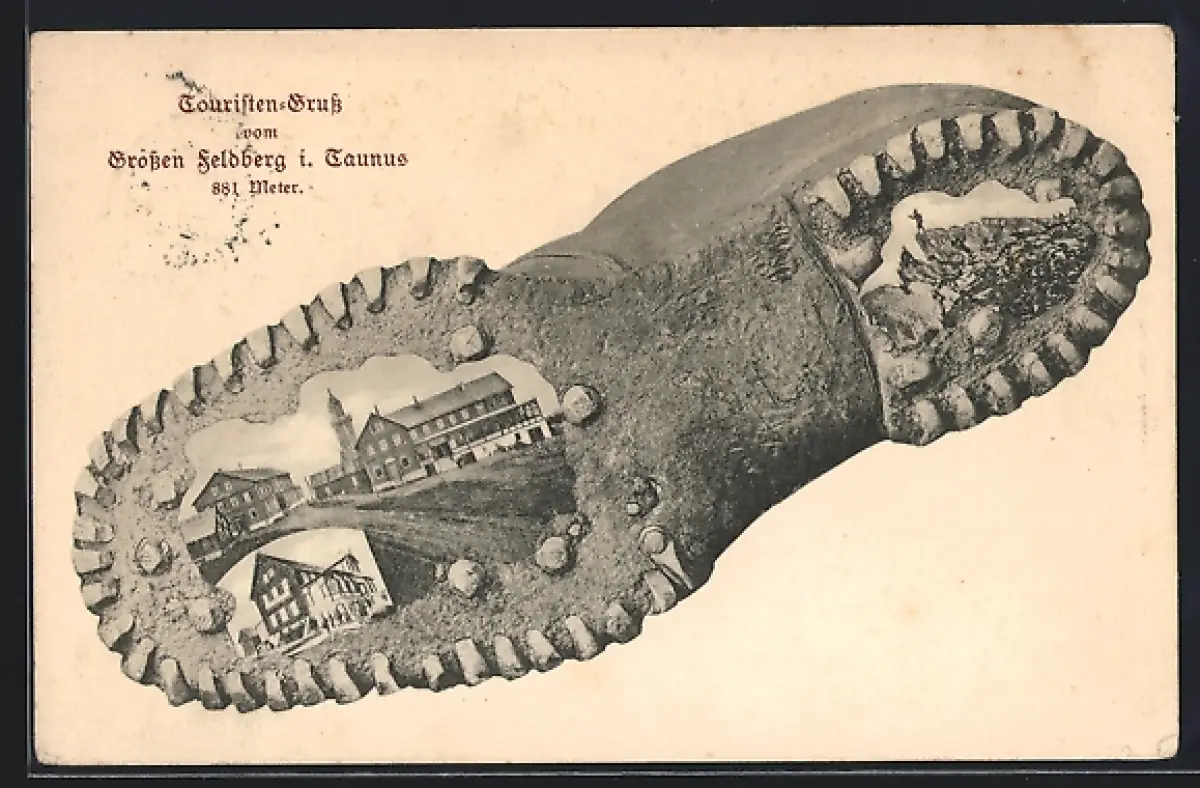 Grusskarten-AK Feldberg / Taunus, Sicht auf das Feldberghaus in einer Schuhsohle, Wanderer-Gruss