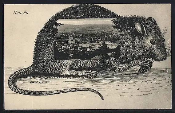 Grusskarten-AK Hameln, Ortsansicht im Ratten-Passepartout