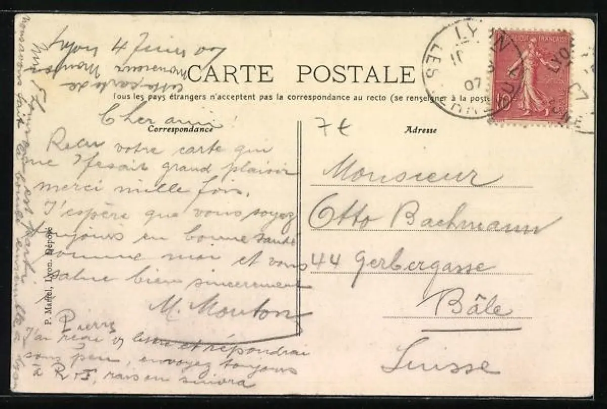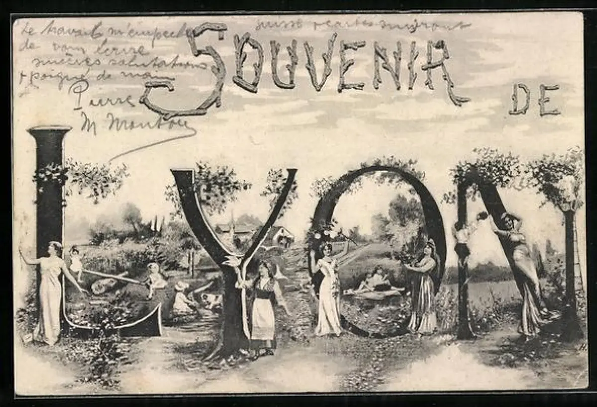 Grusskarten-AK Lyon, Landschaftspanorama mit Buchstaden und Frauen