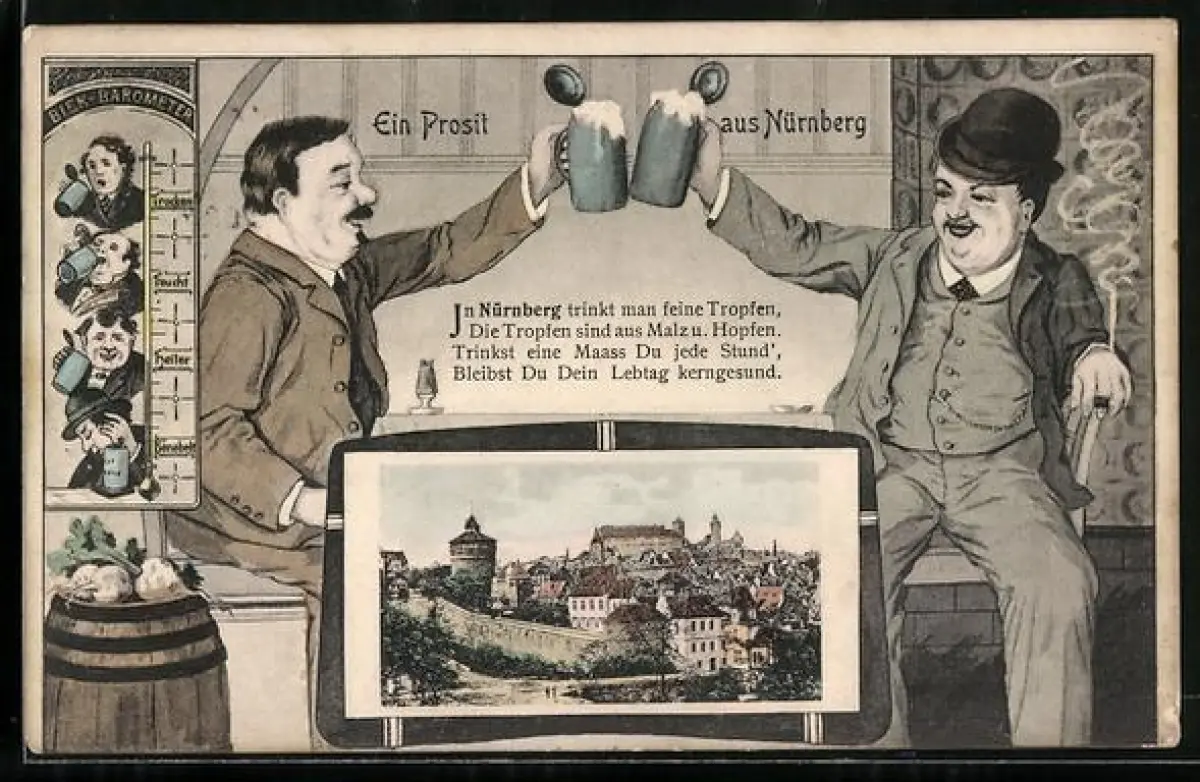 Grusskarten-AK Nürnberg, Ortsansicht, Männer prosten sich mit einer Mass zu