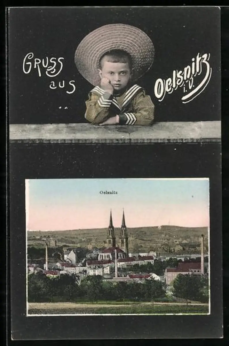 Grusskarten-AK Oelsnitz / Vogtland, Teilansicht mit Kirche, Junge im Matrosenhemd