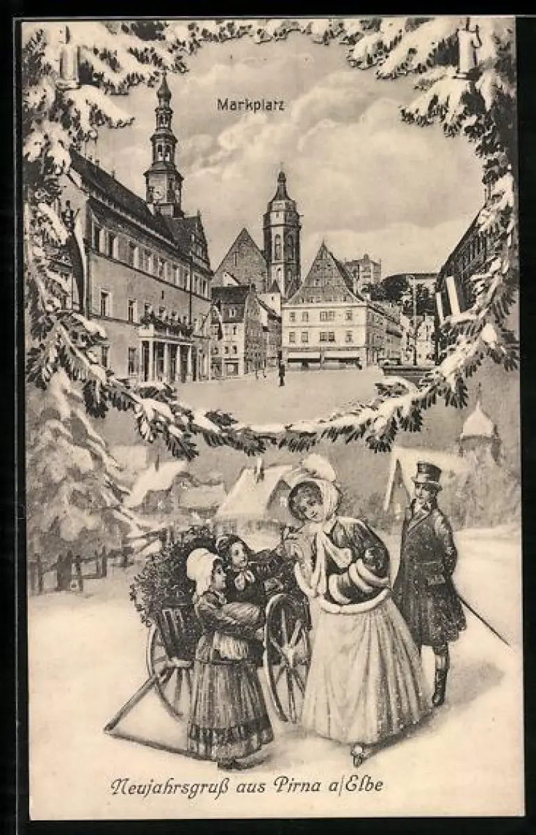 Grusskarten-AK Pirna a. Elbe, Marktplatz, Familie mit Karren