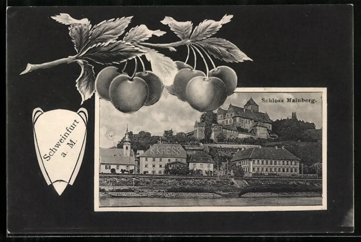 Grusskarten-AK Schweinfurt a. M., Schloss Mainberg mit Kirschen im Passepartout
