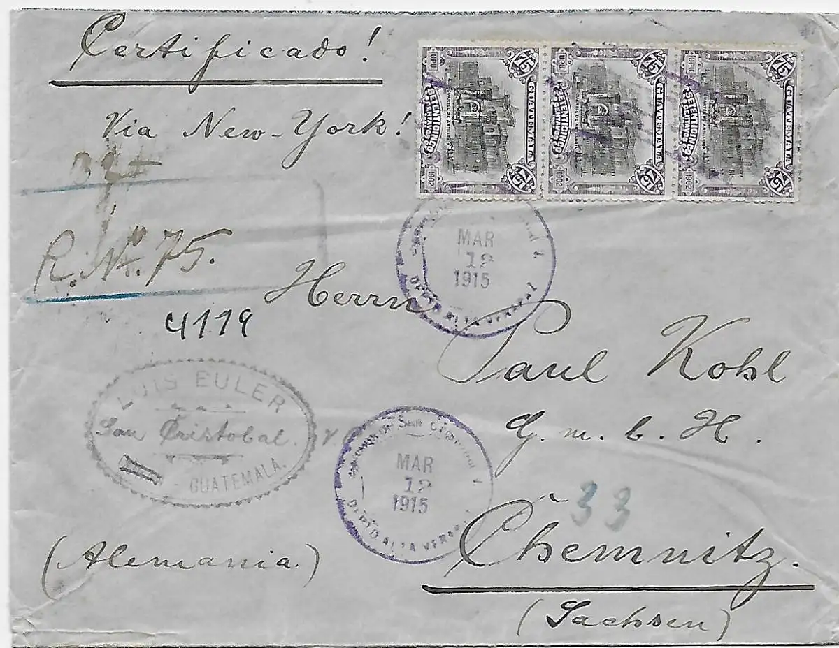 Guatemala 1915: Registered via New York to Chemnitz/Germany