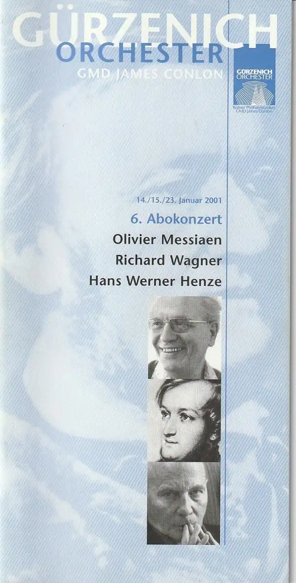Titel: Programmheft GÜRZENICH ORCHESTER 6. ABOKONZERT 14. / 15. / 23. Januar 2001 OLIVIER MESSIAEN / RICHARD WAGNER / HANS WERNER HENZE